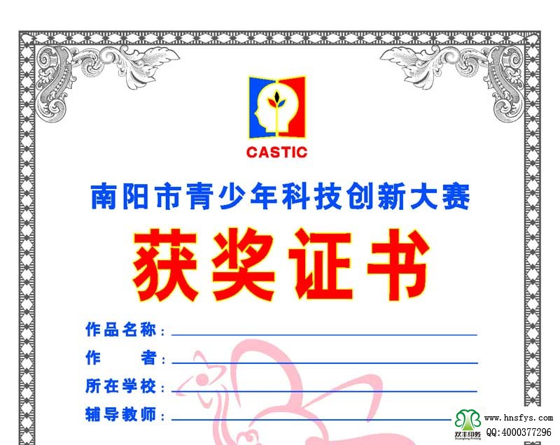 河南印刷廠:青少年科技創(chuàng)新大賽獲獎證書印刷